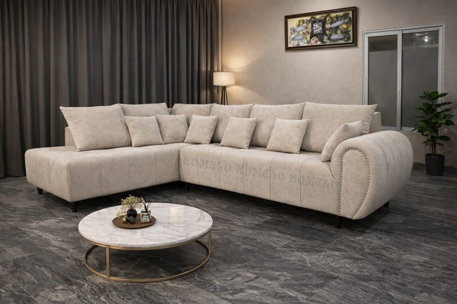 This premium L Shaped sofa is a Six Seater upholstered with premium boucle Fabric.